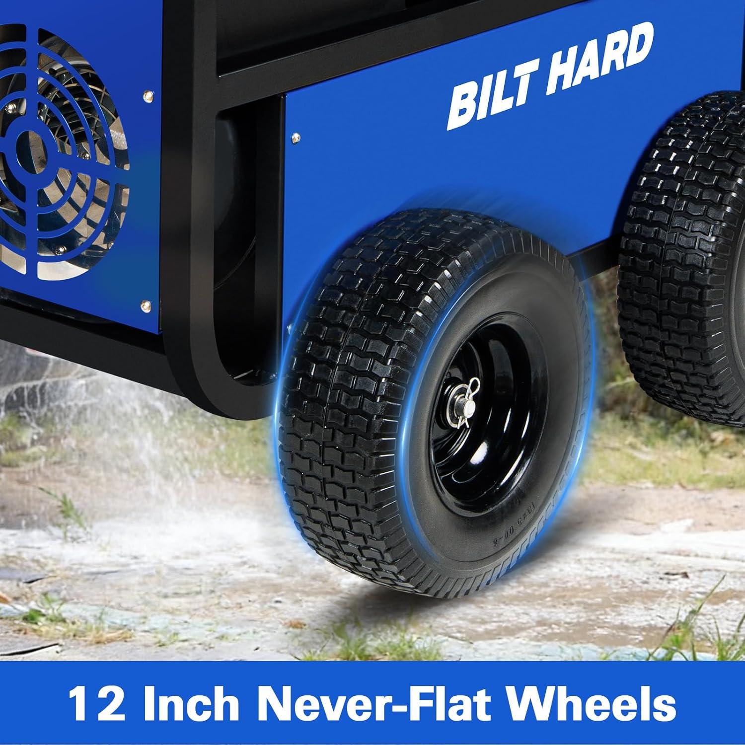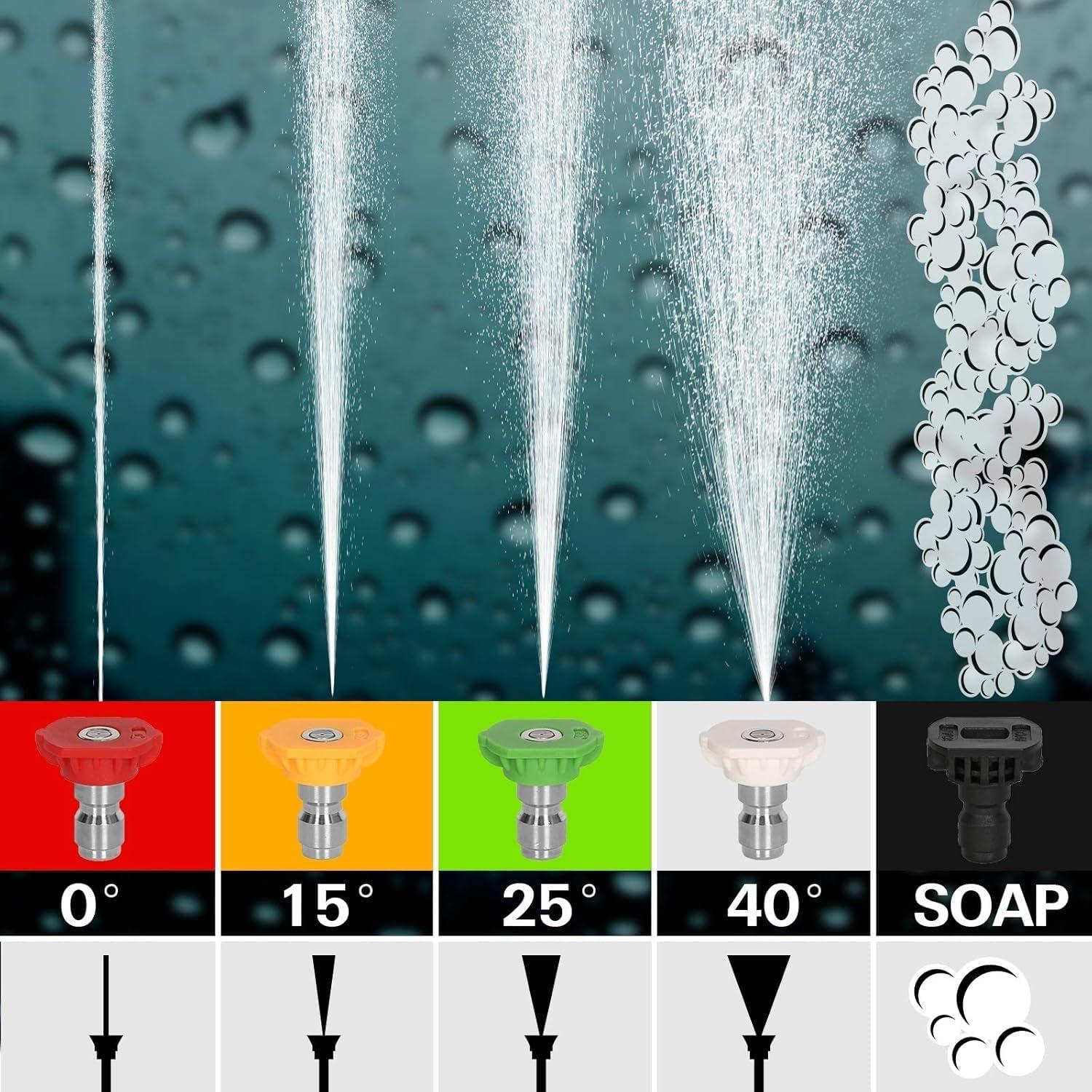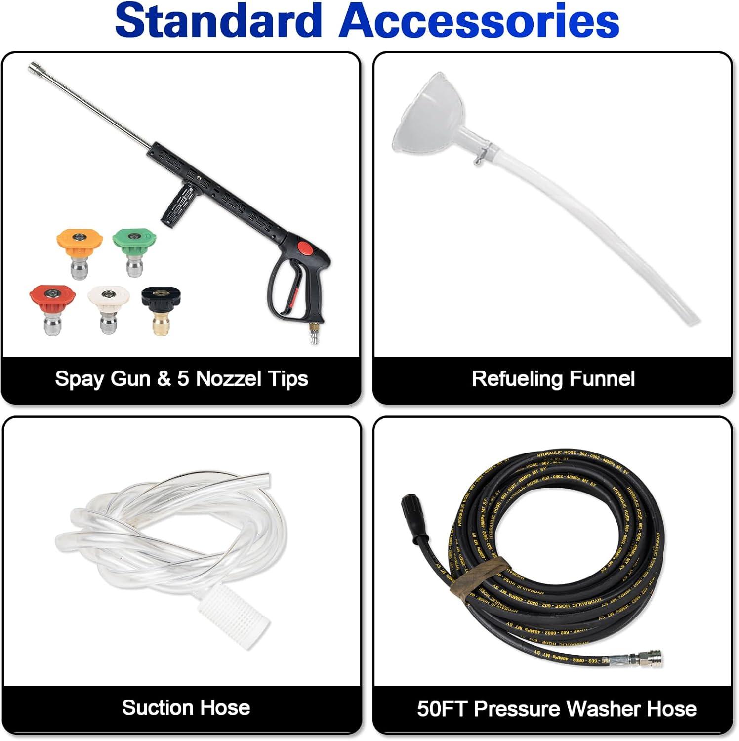Versatile Cleaning Options: Comes with a premium 50 ft high pressure hose, a spray gun with 5 quick connect nozzles (0°, 15°, 25°, 40°, and soap), and large solid tires for smooth mobility over rough or uneven surfaces. Ideal for farms, construction and industrial, it is your reliable partner for all heavy‑duty cleaning needs.