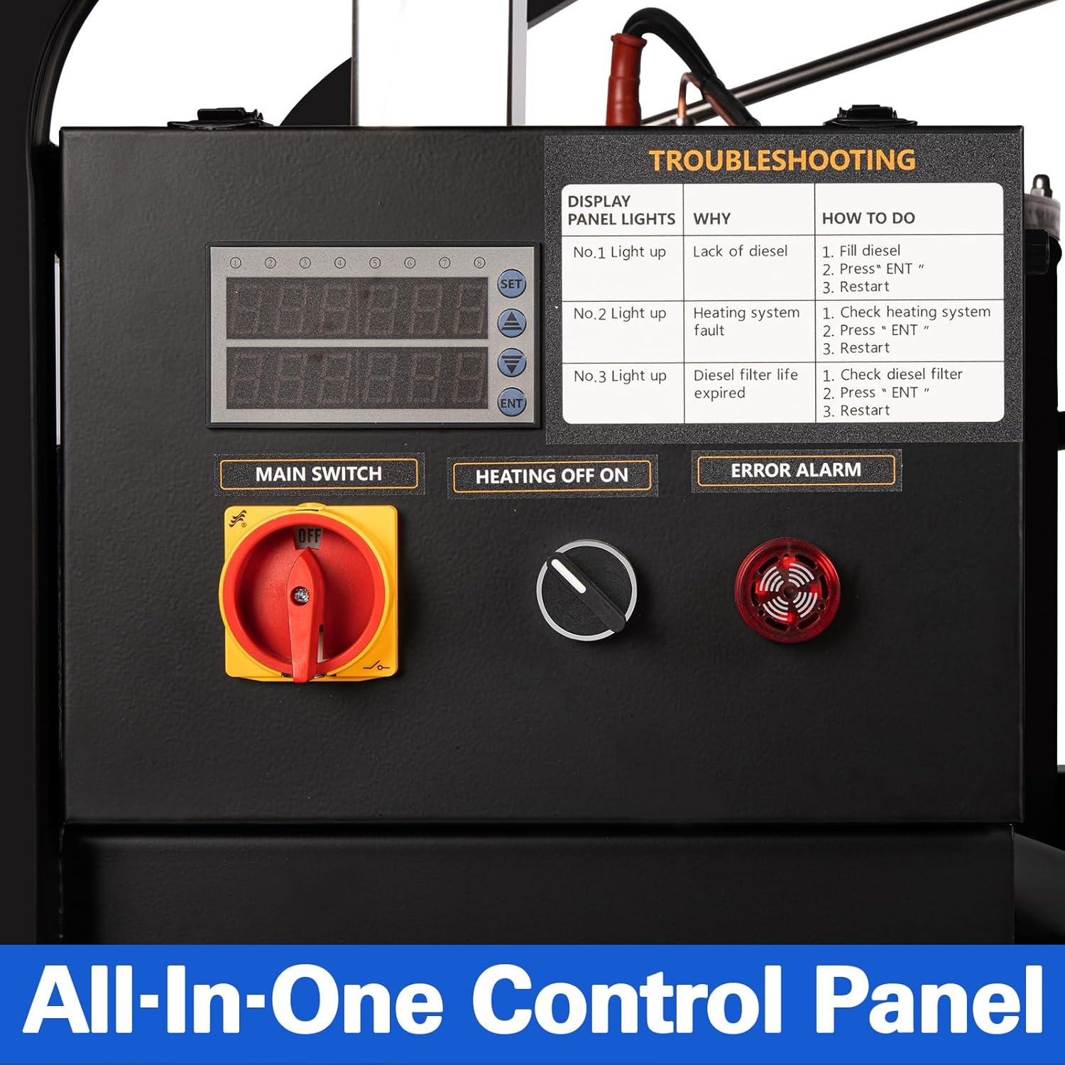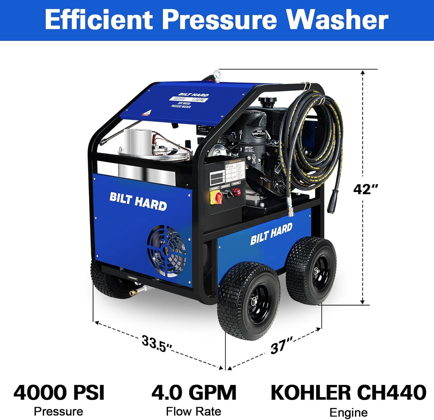 Precision Temperature Control: This pressure washer provides adjustable hot water up to 200°F at 4 GPM and 4,000 PSI, with an LED display for accurate temperature adjustments. Additionally, digital control panel equipped with a built-in error alerts for safety. Built for professionals who demand reliability and consistent 4000 PSI cleaning power.