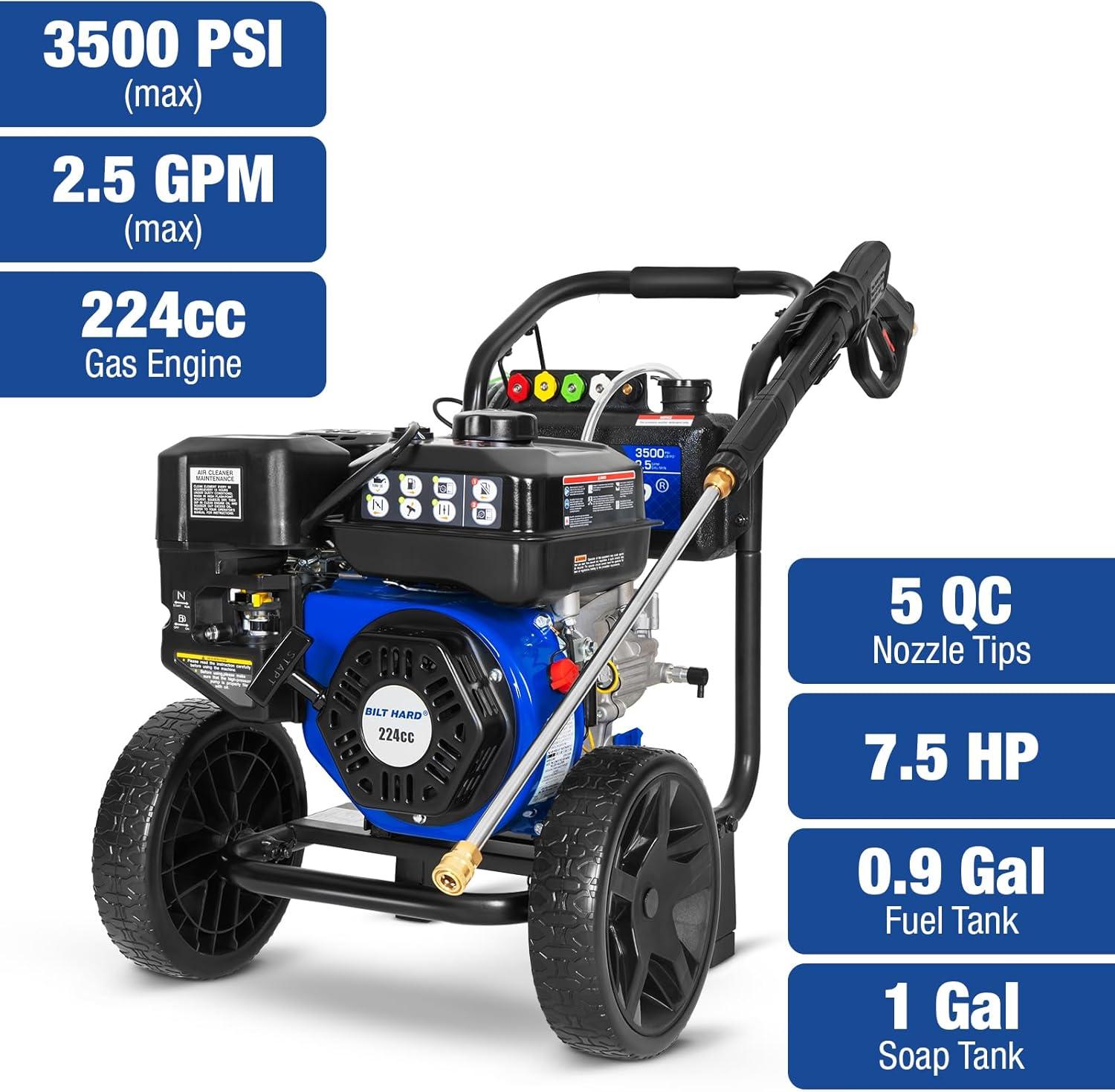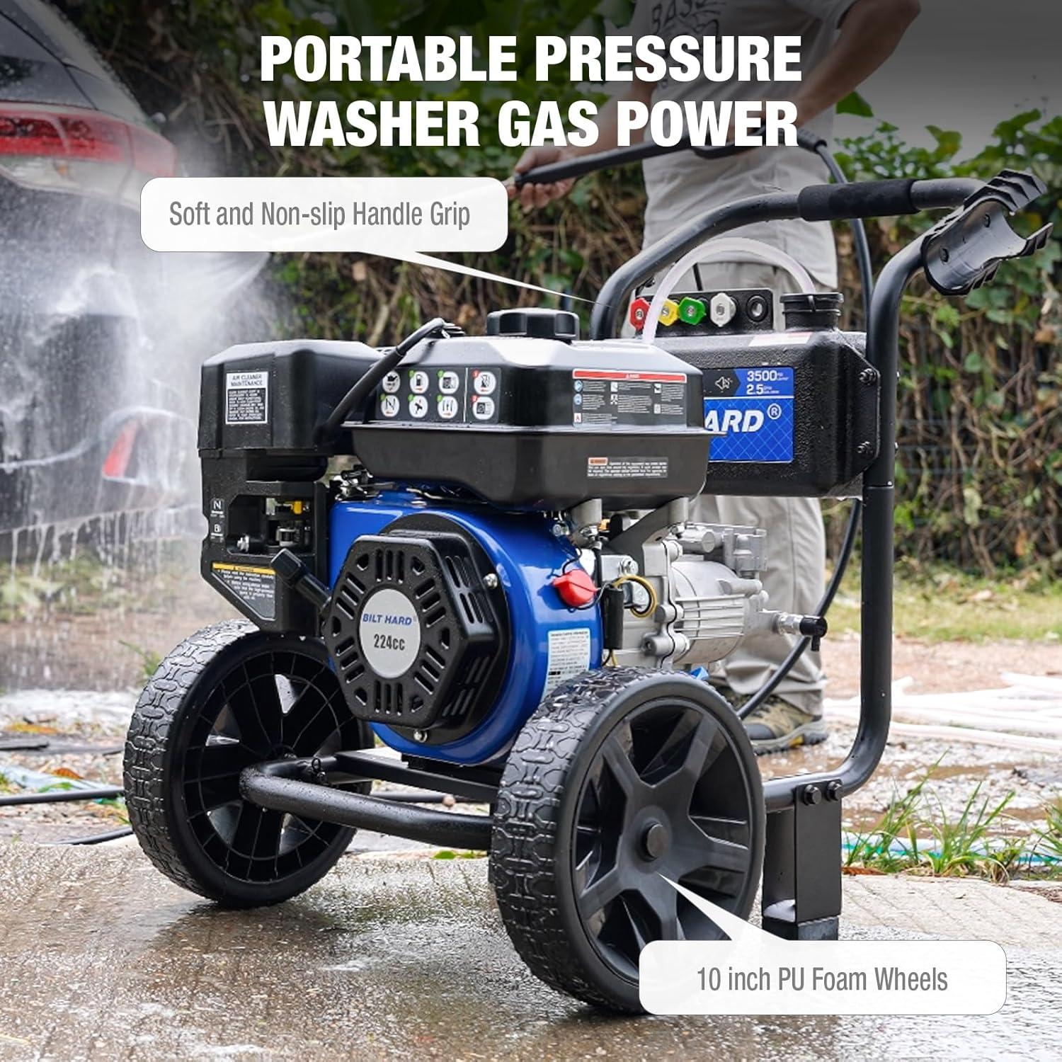 【Heavy-Duty Durability】Rugged steel frame with powder-coated finish resists corrosion and impact. Maintenance-free axial cam pump delivers up to 3500 PSI and 2.5 GPM water flow. 3/5″ × 25' steel-braided hose is kink-free, non-marring, and abrasion-resistant.