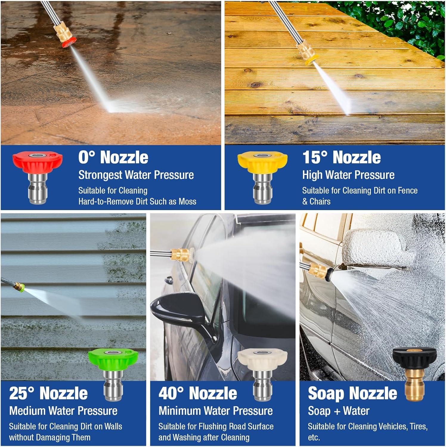 【Versatile Cleaning Options】Includes 5 quick-connect nozzles: 0° (Red), 15° (Orange), 25° (Green), 40° (White), and Soap (Black). Switch easily between high-pressure jet and wide spray for cleaning metal, wood, concrete, glass, and vehicles.