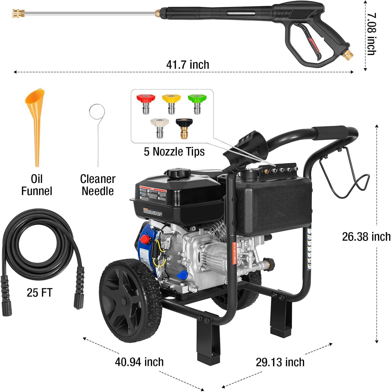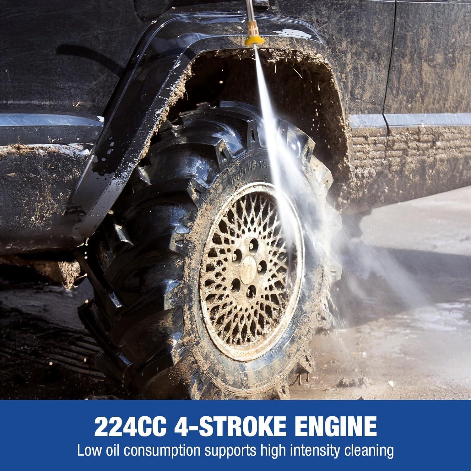 【Powerful Performance】Equipped with a 7.5HP 224cc 4-stroke OHV engine delivering up to 9.96 ft-lbs torque, this gas pressure washer provides reliable cleaning power for decks, fences, driveways, and professional jobs like wood restoration and paint prep.