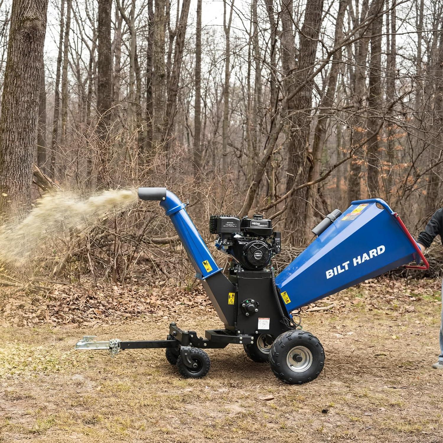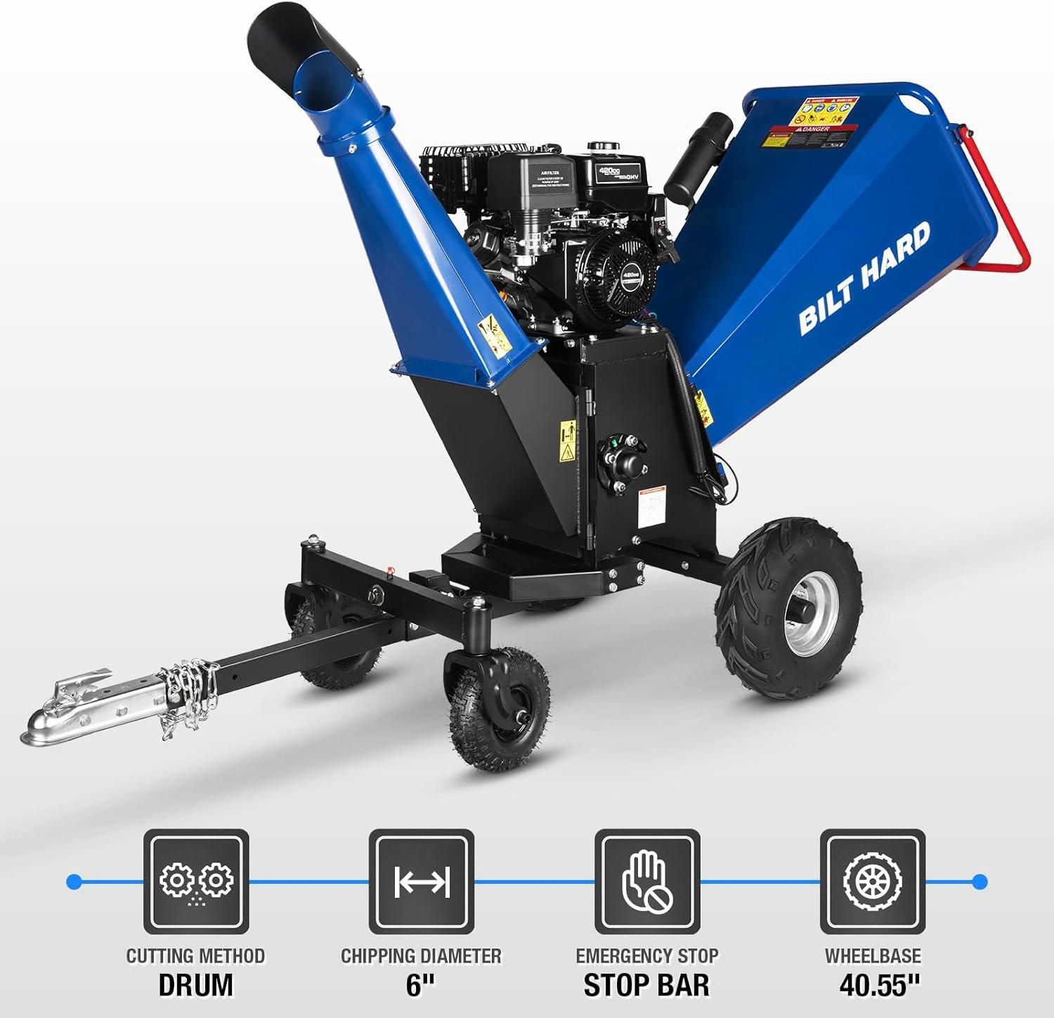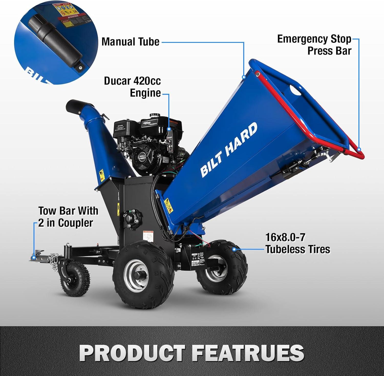 Powerful Ducar 4-Cycle Gas Engine: The BILT HARD 6″ towable wood chipper is equipped with a robust 15HP 420cc air-cooled 4-stroke gas-powered OHV engine featuring electric start. Supported by a reliable 12V 18Ah lead-acid battery, it ensures quick and effortless startups every time.