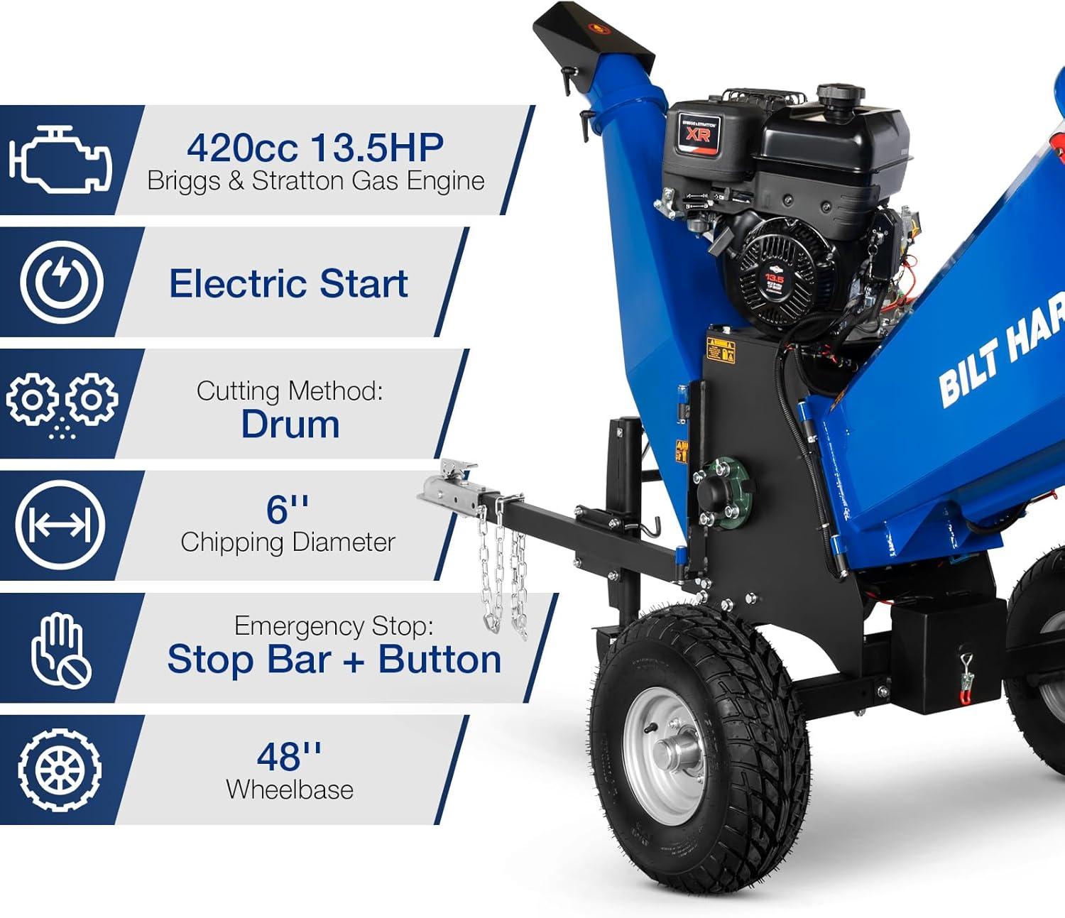 BILT HARD 6-Inch Gas Drum Wood Chipper with B&S E-Start 13.5HP 420cc Engine, Gas Powered Wood Chipper Shredder Mulcher with 2” Coupler Tow Hitch/Emergency Stop(13.5HP B&S)