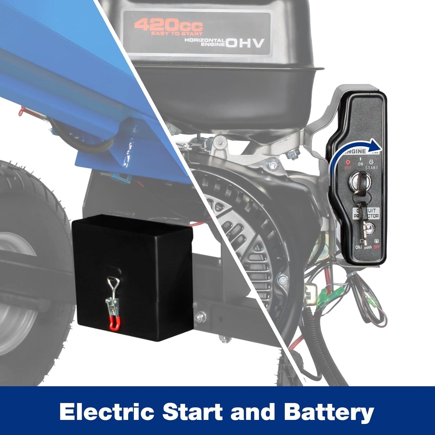 Effortless Mobility & Convenience: Equipped with a reversible 2″ coupler hitch for easy towing behind a lawn tractor or ATV, and large 19″ wheels for smooth traversal over varied terrain. A 360° rotatable discharge chute with adjustable deflector improves debris control and loading coordination.