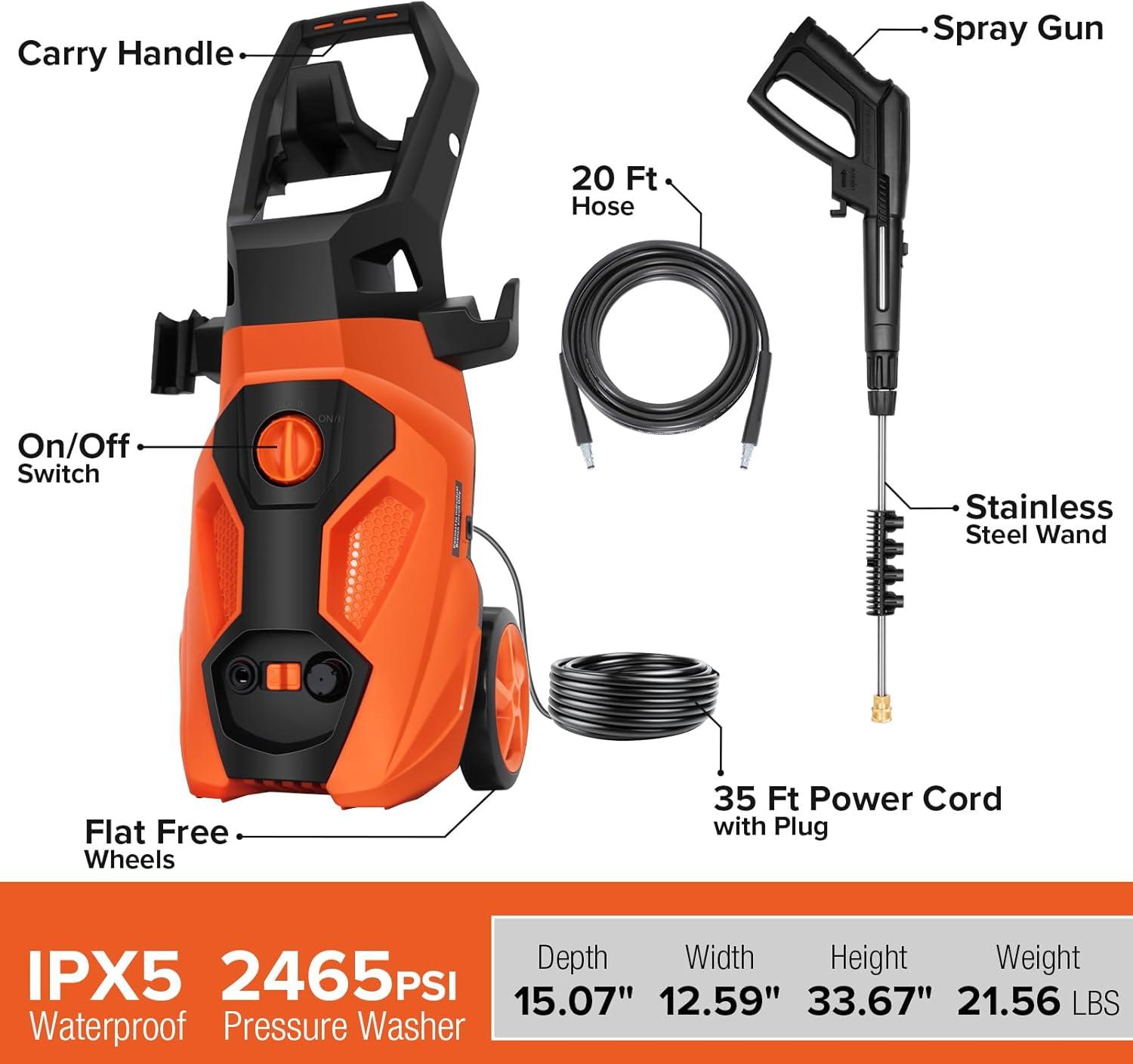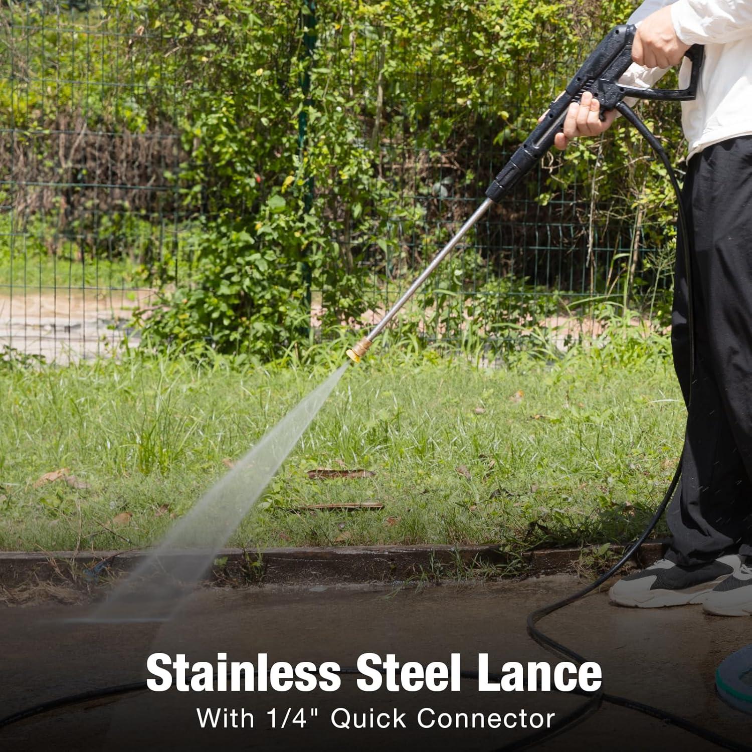Versatile Use – The power washer includes a quick-connect stainless steel wand and five spray nozzles (15°, 25°, 40°, soap, and turbo) to cater to different cleaning tasks. The built-in detergent tank ensures easy and effective soap application.