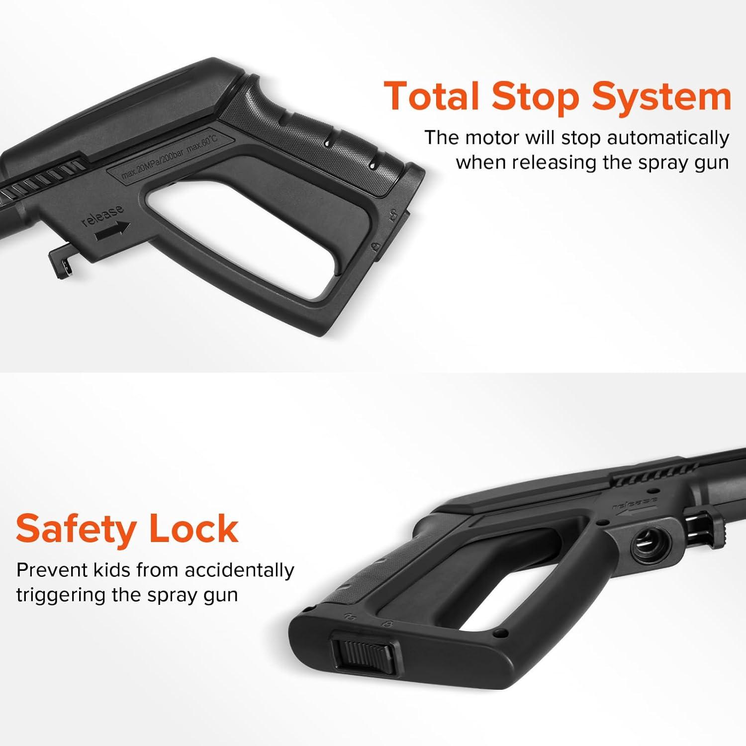Enhanced Safety – The TSS (Total Stop System) automatically shuts off the motor when the trigger is released, conserving energy and extending the life of the pump and motor. A safety lock button prevents accidental spraying, and the GFCI plug ensures safe outdoor use.